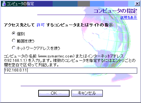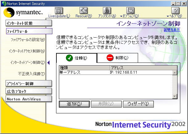 ファイアーウォールの設定。 XPの時と同じ設定をします。 今度はノートンインターネットセキュリティ2002です。 ファイアーウォールの設定のところからインターネットゾーン制御の画面を開いて そこから設定していきます。 固定IPアドレスの192.168.0.11を入力してOKをクリック 「自宅LANを始めよう!〜LANの概要とフォルダ共有編〜」のTOPへ